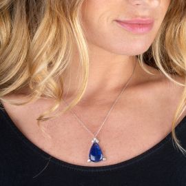 in oro bianco 18kt, pendente a forma di goccia con una tanzanite taglio cabochon di ct 25 circa e diamanti taglio brillante per ct 0.35 circa, punzoni 750 e del fabbricante "1617 AR", lungh. cm 44,5, gr. 9. Corredata di perizia Lineagem Spa attestante le caratteristiche della pietra.