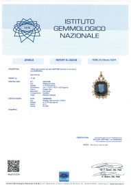 in oro giallo 18kt, impreziosita da diamanti taglio brillante per ct 3.80 circa, da cui pende un ciondolo amovibile impreziosito da uno zaffiro centrale taglio ottagonale di ct 21 circa circondato da diamanti taglio navette, ovale e a goccia per ct 3.70 circa, punzoni 750 e del fabbricante, lungh. cm 40, dim. pendente cm 2x3,5, gr. 82. Corredato di certificato IGN del 20/03/2024 attestante le caratteristiche del pendente e l'assenza di trattamenti termici.