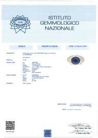 in oro bianco 18kt, impreziosito al centro da uno zaffiro taglio cabochon di ct 8.50 circa, circondato da pavé di diamanti taglio brillante e carré per ct 3.20 circa, firmato "Faraone", punzone 750, mis. 20/60, gr. 11. Corredato di certificato IGN del 13/03/2024 attestante le caratteristiche.