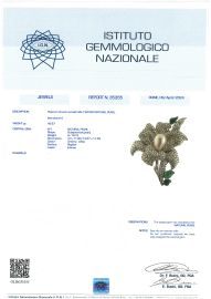 in platino, impreziosita da foglie in smeraldo inciso e al centro da una perla naturale a forma di goccia di mm 12x17 circa circondata da pavé di diamanti taglio brillante e baguette per ct 15 circa, dim. cm 6x7, gr. 43. Corredata di certificato IGN del 9/04/2024 attestante le carateristiche della perla.