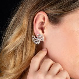 in oro bianco 18kt, realizzati a tralci, impreziositi da diamanti taglio huit huit e tapes per ct 1.60 circa, chiusura a clip, punzoni 750 e del fabbricante "180 AL", dim. cm 2x2,5 circa, gr. 14 complessivi