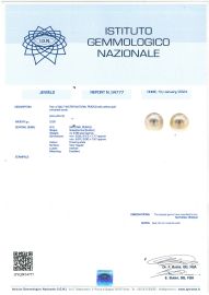 in oro giallo 18kt, due perle naturali per ct 9 circa, chiusura a farfallina, punzone 750, dim. cm 1x1,5 circa, gr. 2 complessivi. Corredato di certificato IGN del 10/01/2024 attestante le carateristiche.