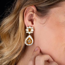 in oro giallo 18kt e parti in madreperla, impreziositi da quarzi citrini sfaccettati, chiusura a clip, dim. cm 2x4,5 circa, gr. 38 complessivi