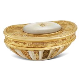 in oro giallo e madreperla, lavorata a incisione, con corpo e coperchio raffiguranti scene campestri cinte da ghirlande, al centro un diamante taglio vecchio di ct 0.20 circa, dim. cm 7x4x3 circa, gr. 68