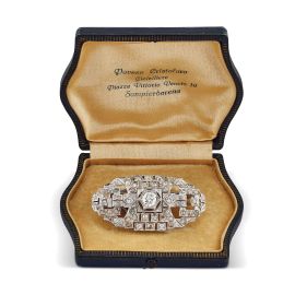 in oro bianco 18kt, impreziosita da diamanti taglio vecchio e a rosa per ct 1.30 circa, con al centro un diamante taglio vecchio di ct 1.10 circa, punzone 750, dim. cm 5x2,5, gr. 13. Corredata di scatola.