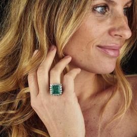in oro bianco 18kt, smeraldo centrale di ct 5 circa, circondato da una fila di diamanti taglio brillante per ct 2 circa, mis. 13/53, gr. 8