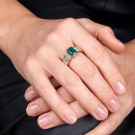 in oro giallo 18kt, impreziosito al centro da uno smeraldo taglio ottagonale di ct 1.50 circa, affiancato da diamanti taglio brillante per ct 1.20 circa, mis. 20/60, gr. 9