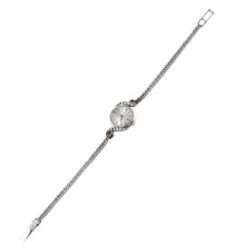 cassa in oro bianco 18kt, quadrante argenté firmato "Baume & Mercier", indici applicati, ghiera impreziosita da diamanti (uno mancante), movimento a carica manuale, bracciale integrato in oro bianco 18kt, lungh. cm 16,5, gr. 12. Diam. mm 15