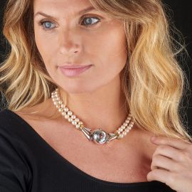 realizzata a doppio filo di perle di mm 7 circa, con elemento centrale in oro bianco e giallo 18kt impreziosito da un grande quarzo sfaccettato e diamanti taglio brillante per ct 0.20 circa, lungh. cm 39, gr. 78