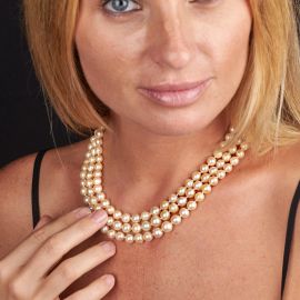 composta da tre fili di perle leggermente digradanti di mm 9-6 circa, fermatura in oro 18kt, punzone 750, lungh. cm 42, gr. 101