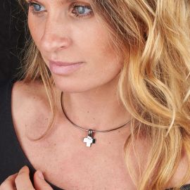 in oro bianco 18kt, da cui pende un ciondolo a forma di croce firmato "Pomellato", punzoni 750 e del fabbricate, dim. pendente cm 1,5x2,5 circa, circonferenza cm 38, gr. 18. Corredato di scatola e garanzia.