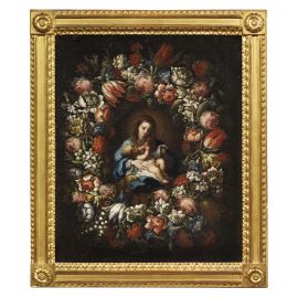 MADONNA COL BAMBINO ENTRO GHIRLANDA DI FIORI