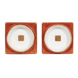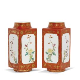 中国 二十世纪 珊瑚红地描金开光四季花卉琮式瓶一对 高 22,3厘米
