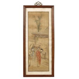 su seta, raffiguranti scene di vita quotidiana all’aria aperta, con donne e bambini.