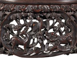 in legno duro intagliato con un cervo, un'aquila, qiling e rami di vite su tutta la base superiore; intagliato con rami floreali avvolgenti, pipistrelli, nuvole e sul corpo centrale dei personaggi, con placca in marmo color rosa grigia nel centro intagliati con fiori e figure mitologiche.