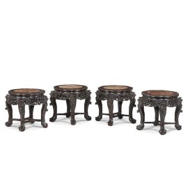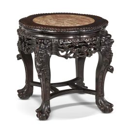 清十八到十九 硬木嵌大理石家具一组 包含边半桌一件 圆桌一件 圆凳四件 半桌高 80厘米 宽 145 厘米 纵深 66厘米 圆桌高 81厘米 径 110厘米 圆凳 桌高 41厘米 宽 40厘米 纵深 40厘米