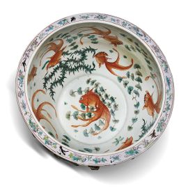 in porcellana con lo smalto giallo chiaro, decorato con tesori preziosi, animali, vasi, fiori, orologi, cestini di fiori; la parte interna è dipinta con otto pesci rossi.