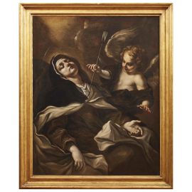 Momento culminante delle visioni estatiche di Santa Teresa, fondatrice dell’Ordine delle Carmelitane Scalze, la “tranverberazione” ovvero il momento in cui il suo cuore viene trafitto dall’Amore Divino, fu scelto per la sua bolla di canonizzazione nel 1622.
