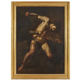Il tema di Prometeo, figlio del titano Giapeto, incatenato e punito da Giove con l’atroce supplizio di avere quotidianamente il fegato divorato da un’aquila per aver donato all’umanità il fuoco rubato agli dei, è stato più volte frequentato da Assereto in tele che condividono con la nostra una certa ferocia, tipica del pittore la cui fantasia era stata del resto definita “terribile” dal già menzionato Soprani. Si veda il terrificante contorcersi e gridare del Prometeo dipinto a mezzo busto sulla tela del Musée de la Charteuse di Douai (Zennaro 2011, cat. A114, pp. 406-410), dove il disporsi in diagonale, le materiche stesure pittoriche e gli strappi luminosi sono caratteristiche che si ritrovano nella nostra tela e che potenziano la sua forte carica espressiva già implicita nel contenuto della scena ed esplicitata dalla drammatica mimica del titano.
