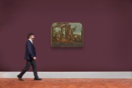 Disperso nei primi anni Sessanta, questo raffinatissimo insieme unico a Roma è stato ricostruito – almeno virtualmente – da Andrea Busiri Vici grazie alla documentazione fotografica anteriore alla vendita di arredi e dipinti, consentendo l’identificazione di molti di essi in collezioni private e sul mercato dell’arte. A quanto già rintracciato si aggiunge oggi il paracamino dipinto dal Monaldi, verosimilmente nel 1767, come si deduce dai pagamenti pubblicati da Busiri Vici.