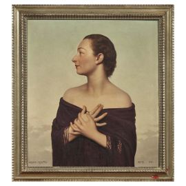 L’artista triestino immortala la ritrattata attraverso la sua inconfondibile cifra stilistica, ove perizia tecnica e minuzia di dettagli, concorrono a restituirci una realtà “oggettiva”, tanto oggettiva da risultare spesso quasi congelata, straniante, onirica, magica. Si tratta della poetica e del fascino della Nuova Oggettività tedesca, del Realismo Magico teorizzato da Massimo Bontempelli.