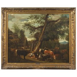 ATTRIBUTED TO JAN VAN GOOL, A LANDASCAPE WITH SHEPHERDS AND HERDS, OIL ON CANVAS, 66X82 CM