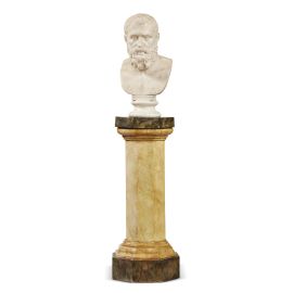 in marmo bianco raffigurante testa maschile barbata, cm 62x31,5x29; su colonna in legno di forma ottagonale dipinto ad imitare il marmo, cm 98,5x35,5x36