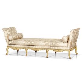 in legno intagliato, laccato e parzialmente dorato, di linea mossa, ai lati due schienali laterali e intaglio sotto la seduta con profilo sagomato a girali e conchiglie dorate centrali, poggiante su otto gambe tozze e arcuate con terminazioni ferine, rivestimento in seta a motivo floreale, cm 85x242x76