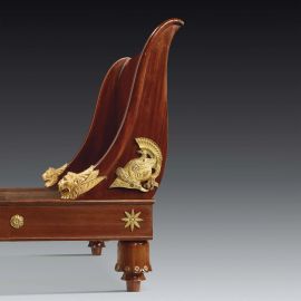 impiallacciato in mogano in stile Impero con applicazioni in bronzo dorato lungo i profili, alta testiera dal profilo sagomato, con sostegni ondulati che terminano in teste leonine e trionfi ai lati, struttura sorretta da piedi a campanula ornati da roselline in bronzo dorato, cm 130x200x113