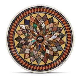 in marmo bianco di forma circolare riccamente intarsiato con campionario di marmi policromi, pietre dure e semi preziose a formare un complesso disegno geometrico, centrato da un medaglione a micromosaico raffigurante "Le colombe di Plinio", soggetto tratto dagli scavi di Villa Adriana a Tivoli del 1737, diam. cm 88. Poggiante su base in legno con fusto scanalato, alt. cm 56