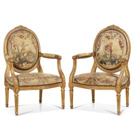 in legno intagliato e dorato, schienale di forma ovale sormontato da volute fogliacee, braccioli diforma leggermente mossa, intagli vegetali lungo i profili, pogginati su piedi scanalati; sullo schienalerivestimento in arazzo raffigurante scene galanti da François Boucher mentre sulla seduta rivestimento in arazzo raffigurante composioni floreali, cm 102x142x58 e cm 101x67,5x52A