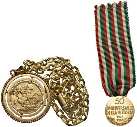UNA STERLINA MONTATA SU CATENA E UNA MEDAGLIA ORO 750 PER IL 50° ANNIVERSARIO DELLA VITTORIA (1918-1968)