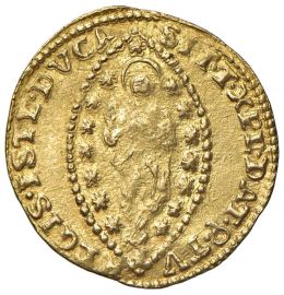 Au gr.3,48 S. Marco nimbato, stante a s., porge il vessillo al Doge genuflesso R/ Il Redentore entro un’aureola ellittica stellata. Mont. 2508 Fr. 1384 Gig. 66