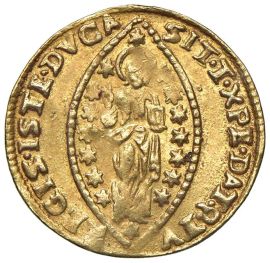 Au gr.3,50 S. Marco nimbato, stante a s., porge il vessillo al Doge genuflesso R/ Il Redentore entro un’aureola ellittica stellata. Mont. 2329 Fr. 1372