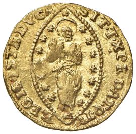 Au gr.3,49 S. Marco nimbato, stante a s., porge il vessillo al Doge genuflesso R/ Il Redentore entro un’aureola ellittica stellata. Mont. 2644 Fr. 1401 Gig. 68