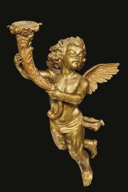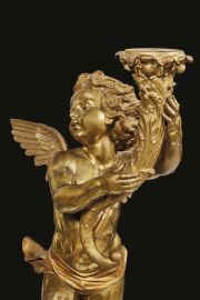 coppia di grandi sculture in bronzo dorato raffiguranti angeli in volo, entrambe le braccia sollevate a reggere una torcera sagomata a cornucopia, il bacino coperto da un panno svolazzante, le ali spiegate finemente cesellate a rendere le piume; cm
