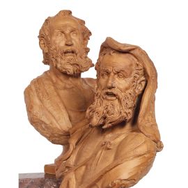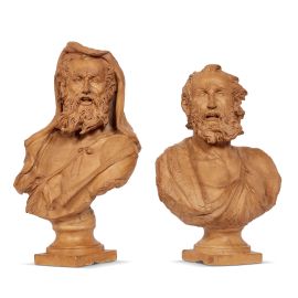 in terracotta patinata raffiguranti due personaggi maschili barbati, uno con il capo coperto da un cappuccio, entrambi caratterizzati dalla lunga barba che sembra mossa dal vento; cm 54,5x34,5x21,5 e cm 48x36,5x20