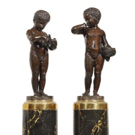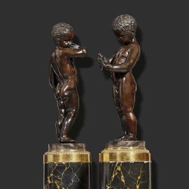 Questa affascinante coppia di bronzi segue i modelli dello scultore francese Charles-Antoine Bridan. Mentre il bambino tiene tra le mani una piccola colomba, che sembra avere tra zampe un foglietto probabilmente con un messaggio, la bambina tiene nella mano sinistra un nido vuoto, e il suo volto è piuttosto imbronciato, forse perché l’uccellino è stato preso dal suo nido. Le prime versioni in marmo di Bridan furono eseguite per il cardinale de Luynes nel 1759, ed una versione in terracotta proveniente dallo studio dello scultore si trova al Musée des Beaux Arts di Chartres. La fortuna che incontrò questo soggetto è testimoniata dalle tante riproduzioni in bronzo e marmo, realizzate ad esempio in Francia da Pierre-Philippe Thomire in Francia (una sua coppia in bronzo è conservata oggi al Musée de Camondo di Parigi (Inv. CAM 325), ma anche in Italia da Francesco Righetti e Carlo Albacini.