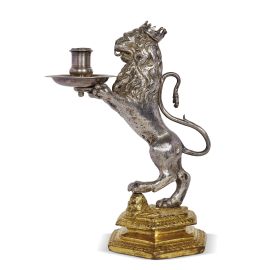 in argento, raffigurato in posizione eretta con la testa coronata e le zampe anteriori protese in avanti, a reggere ora un piattino con bobeche portacandela non pertinente, al cui posto in origine probabilmente stava uno scudo con stemma araldico; le zampe posteriori poggiano invece su una base esagonale modanata in metallo dorato, sbalzata nella parte superiore ad imitare un terreno erboso. Un interessante confronto ci viene da un'analoga figura ricondotta alla cerchia di Hubert Gerhard (Hertogenbosch 1550 – Monaco di Baviera 1620), scultore olandese formatosi tra l'altro a Firenze dove subì l'influsso di Giambologna; cm 22x9,5x15,5