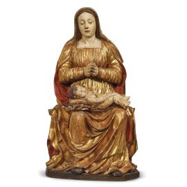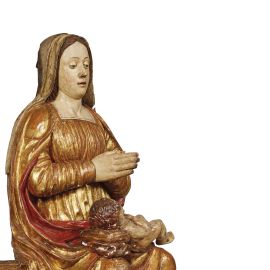 scultura in legno dipinto in policromia e oro, la Vergine raffigurata seduta con le mani giunte al petto e il Bambino sdraiato sulle sue ginocchia, secondo il tipico modello veneto. Quest’importante opera è stata attribuita con sicurezza da Raffaele Casciaro alla mano dell’intagliatore bresciano Maffeo Olivieri, attivo in Lombardia, a Venezia e in Trentino spesso in coppia con il fratello minore Andrea, che in essa vede gli sviluppi monumentali tipici della sua fase più matura, riferibile al ventennio 1520-1540; cm 105x58x32