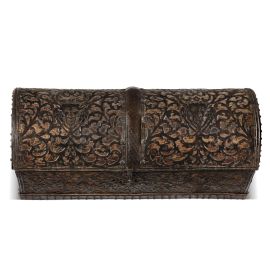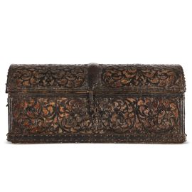 in legno rivestito in cuoio e lamina metallica finemente traforata, di forma rettangolare con coperchio a cupola incernierato. L'intera superficie del fronte è decorata con girali, mascheroni e mostri marini, motivi che si ripetono sul coperchio, centrati da due grandi mascheroni; maniglie sui fianchi e serratura sul fronte in ferro battuto. Un esemplare analogo al nostro fu venduto da Sotheby's a Londra in data 11 dicembre 2002, lotto 112; cm 38x88x34