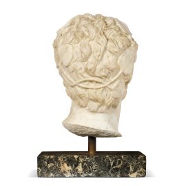 scultura in marmo di ispirazione classica riprodotta in dimensioni più grandi del vero, la testa coronata d'edera e di corimbi e le orecchie a punta; cm 40x30x29. Montata su base rettangolare in marmo verde (cm 6x33x25)