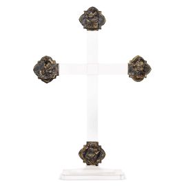 in lamina d’argento con tracce di doratura lavorata a sbalzo e cesello, secondo modelli derivati dalla croce firmata da Nicola di Guardiagrele nel 1434 per la chiesa di Monticchio. Sul fronte in alto è raffigurato Cristo risorto, ai lati la Vergine e San Giovanni evangelista, in basso un Vescovo benedicente, mentre sul retro figurano i quattro Evangelisti, riconoscibili anche per i loro tipici attributi finemente cesellati nella lamina; cm 12x13 circa ciascun terminale. Montati su croce in plexiglass completa di base, cm 86x60 complessivamente