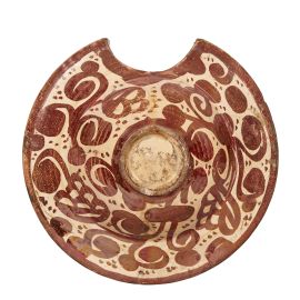 in maiolica decorata a lustro metallico, corpo di forma circolare, cavetto profondo e larga tesa con un incavo a mezzaluna. Il decoro, piuttosto diluito, mostra serti vegetali accompagnati da puntinature e riccioli lungo i bordi, con linee concentriche spesse a circondare la tesa. Anche il retro è completamente dipinto con il caratteristico motivo a “brochettes de rognons”; diam. cm 31,2, diam. piede cm 8, alt. cm 9,6
