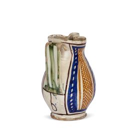 in maiolica dipinta in policromia nei toni del giallo, blu, verde e manganese, corpo piriforme con ventre globulare, imboccatura trilobata e larga ansa a nastro, piede a disco a base piana. L’intera superficie mostra un decoro “a settori” sviluppato su fasce verticali alternate con motivi geometrici e reticoli. Sul retro, sotto l’ansa è presente una lettera b tracciata in manganese. Sul fondo etichetta RACCOLTA DEL C.TE UGOLINO DELLA GHERARDESCA con numero 61; alt. cm 19, diam. piede cm 8,2