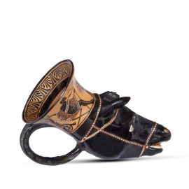 in terracotta decorata a figure nere, corpo sagomato a testa di asino a riprodurre i rhyton antichi. Per qualità e rarità, ma anche per lo stile pittorico particolarmente accurato, l’opera è attribuibile all’opera della manifattura Giustiniani; lungh. cm 22, diam. bocca cm 10,4