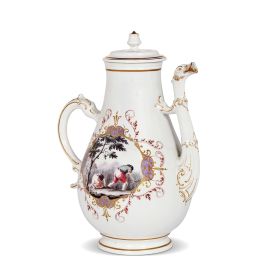 in porcellana dipinta in policromia e oro, corpo piriforme, versatoio sagomato e terminante in una testa di serpe, ansa a orecchio, coperchio leggermente convesso con presa a pigna. Il decoro in policromia mostra il caratteristico motivo “alla sassone” con due scene di vita popolare (mietitura e lavandaie) entro articolate riserve sagomate. La forma dell’ansa e del cannello è impreziosita da tocchi di oro; alt. cm 25, diam, bocca cm 8,5, diam. piede cm 6,7