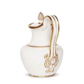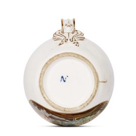 in porcellana dipinta in policromia e oro, di forma poco documentata nella manifattura ferdinandea, con corpo piriforme, doppia ansa a nastro che termina in un mascherone appena accennato e ornato di oro, imboccatura trilobata sormontata da coperchio coerente con presa a pigna. Il corpo è sottolineato da filetti in oro, mentre la decorazione principale è limitata a un medaglione ovale che contiene una veduta policroma. Marca N in blu sul fondo; alt. cm 13,4, diam. piede cm 5,5