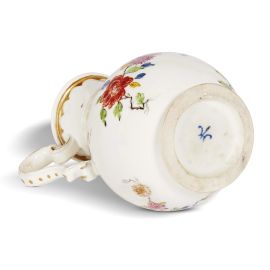 in porcellana dipinta in policromia e oro, corpo piriforme con manico modellato a forma mistilinea, beccuccio a balaustra e coperchio a calotta con presa a bottone dipinto in oro. Il decoro è distribuito a coprire il corpo con radi mazzetti di fiori alla coreana, che ritornano anche sul coperchio, mentre l’orlo è sottolineato da un motivo in oro. Marca giglio in blu sul fondo; alt. cm 18,5, diam, bocca cm 6, diam. piede cm 6,1