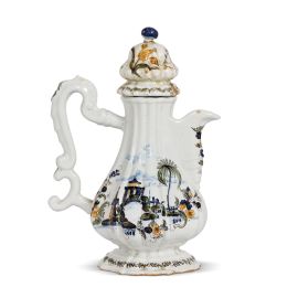 in maiolica dipinta in policromia, corpo piriforme marcatamente costolato poggiante su largo piede sagomato, ansa mistilinea derivata da modello di argenteria, beccuccio triangolare portato alto e aderente al corpo e coperchio “alla persiana” con pomolo a bottone. L’ornato riproduce il fortunato motivo “al ponticello” di ispirazione orientale con pagoda e rocce; alt. cm 26,5, diam. piede cm 11,6